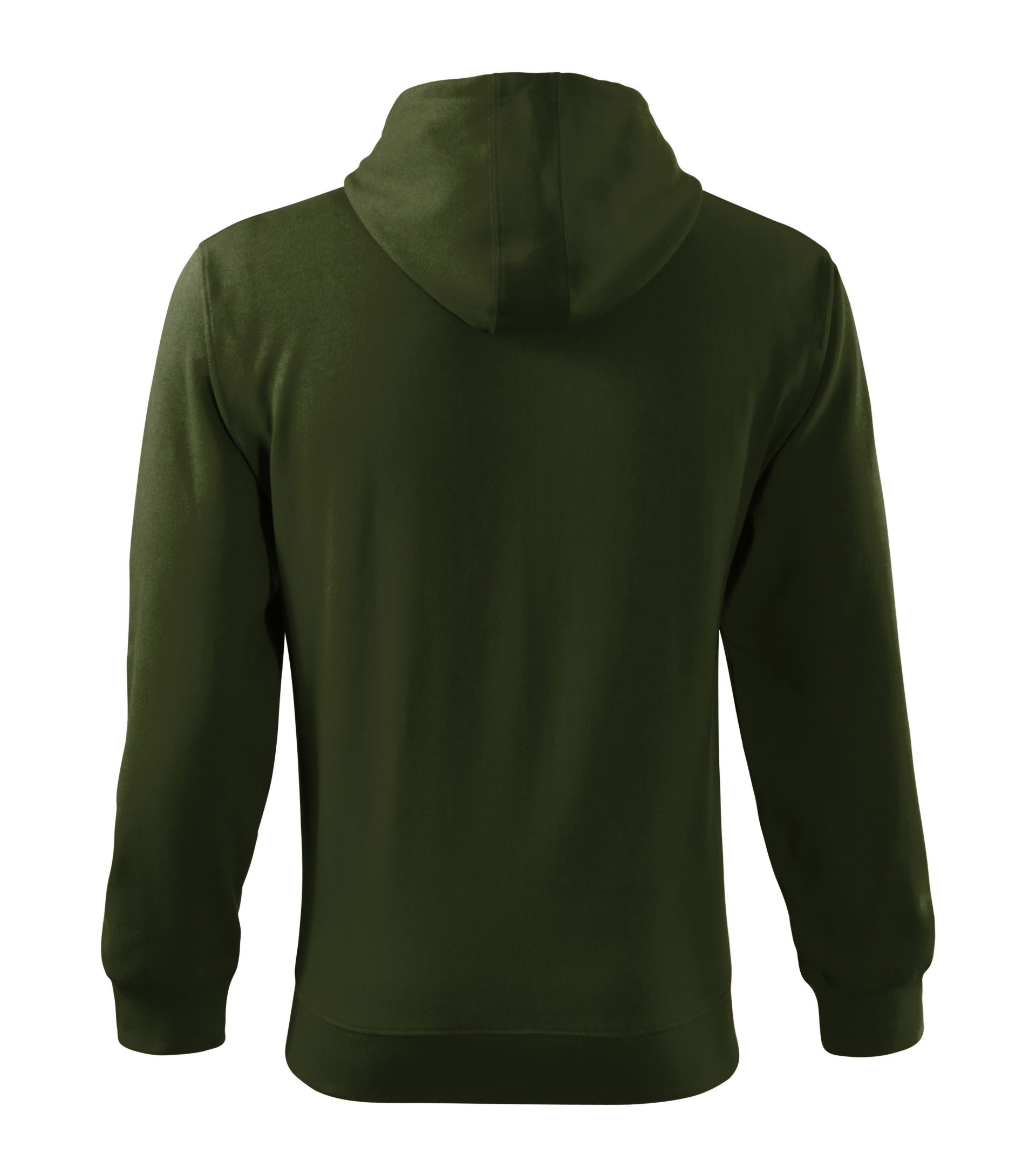 Celopropínací mikina s kapucí, přední kapsa ve stylu klokanky, kapuce s podšívkou, na stažení šňůrkou, lem a manžety rukávů z žebrového úpletu 2:2 s přídavkem 5 % elastanu, sedla a kapsy s dekorativním prošití, vnitřní část průkrčníku začištěna tkanou páskou. Materiál: 65% bavlna, 35% polyester, 300g/m2.