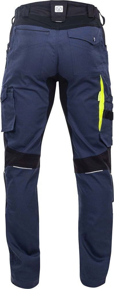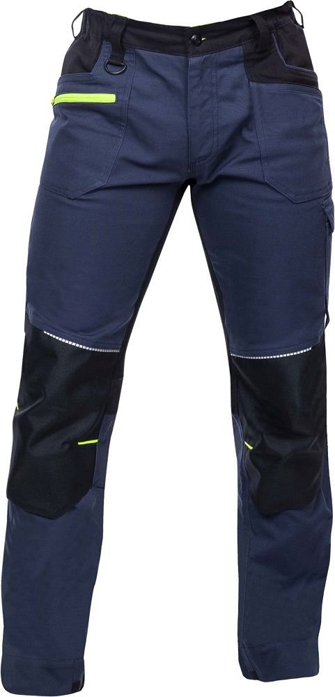Strečové bavlněné montérkové kalhoty do pasu s kapsou na nákoleníky ze speciálního materiálu Amalytton®, který zajišťuje zvýšenou pevnost a odolnost bavlněné tkaniny při zachování komfortu elasticity. Na exponovaných partiích je použitý extra odolný super elastický materiál Tabiflex®. Kalhoty mají vysoce ergonomický a funkční střih SLIM FIT, který zvýrazňuje siluetu. Oblast kolen je zdvojená odolným materiálem Oxford s vodoodpudivou úpravou a vybavená kapsou na nákoleníky, pružný pasový límec spolu se skrytým zadním dvojitým poutkem pro pohodlné usazení opasku, D kroužek na karabinu, řada praktických kapes. Zvýšenou viditelnost uživatele zajišťují reflexní pásky umístěné na předním i zadním dílu a hi-vis doplňky. Kalhoty umožňují snadné prodloužení délky o 5 cm. Materiál: 98% bavlna, 2% elastan, Amalytton®, kanvasová vazba, cca 250 g/m². Ostatní: 65% polyester, 35% bavlna. 100% polyester - Oxford. 88% nylon, 12% spandex, TABIFLEX®.