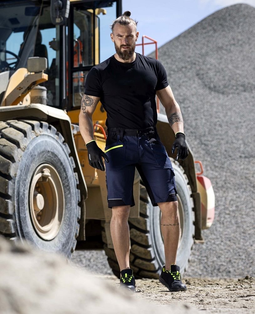 Strečové bavlněné montérkové kraťasy ergonomického a funkčního střihu ze speciálního materiálu Amalytton®, tento materiál zajišťuje zvýšenou pevnost a odolnost bavlněné tkaniny při zachování komfortu elasticity a všech benefitů přírodního materiálu jako je prodyšnost a příjemný pocit při nošení. Na exponovaných partiích je použitý extra odolný super elastický materiál Tabiflex®. Pružný pasový límec spolu se skrytým zadním dvojitým poutkem pro pohodlné usazení opasku, kraťasy jsou vybaveny D kroužkem na karabinu, 2 hlubokými průhmatovými kapsami, 1 přední zipovou kapsou, 1 přední nářaďovou kapsou s širokým poutkem. Na pravé nohavici je umístěna multifunkční kapsa na skládací metr, šroubovák a odlamovací nůž s širokými poutky, na levé nohavici je velká dvojitá kapsa krytá patkou na druk, zadní díl člení sedlo a 2 kapsy, pravá zadní kapsa je krytá patkou na druk. Materiál: 98 % bavlna, 2 % elastan, Amalytton®, kanvasová vazba, cca 250 g/m².