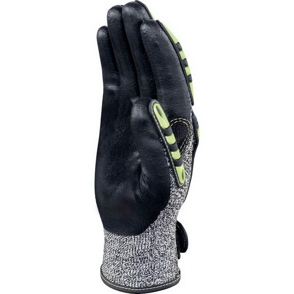 Vysoce odolné polyetylénové vlákno. Neoprénová výztuž na prstech a hřbetu ruky. Hladký nitrilový povlak / nitrilová pěna na dlani a koncích prstů. Reliéfní výztuž uvnitř dlaně. Vlákno Kevlar® na všech švech. Pružná výztuž pro lepší ochranu proti nárazům a sevření., zesílení mezi palcem a ukazovákem a na dlaních, ochrana metakarpální oblasti (záprstních kůstek) 5J (pád tělesa o hmotnosti 1kg z výšky 50cm).